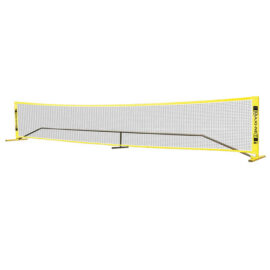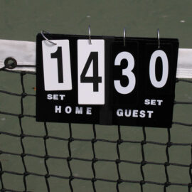 Patented tennis score keeper fits over a round tennis post, attaches to net, or secures to fence. A stainless steel clamp is furnished to secure to post or net. Hooks are supplied for fence mounting. Players use an old tennis ball to keep the score.